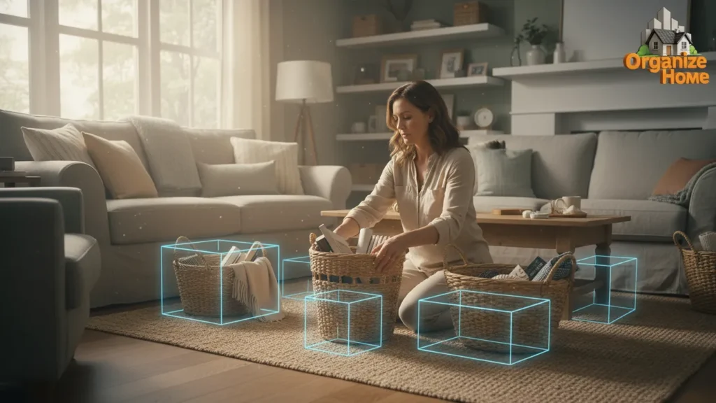Using boxes, bags, laundry baskets, or bins for each zone creates immediate structure. Every item you pick up has a destination right away, which eliminates the habit of setting things down “just for a second” and accidentally creating piles.