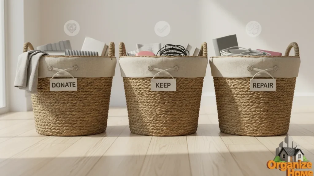 The “keep” zone should remain small and close to where items will return. This prevents unnecessary reshuffling later and reinforces the goal of keeping only what truly belongs in the space. The “let go” zone should be clearly defined so decisions feel final, not tentative.